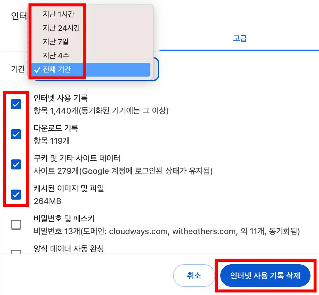 인터넷 사용 기록 삭제 및 캐시 삭제